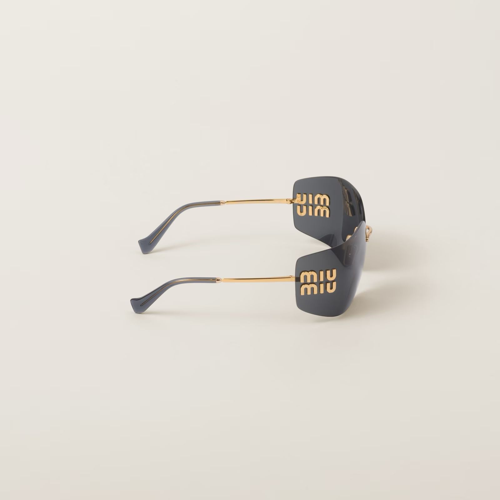 Gafas de sol de metal con un diseño sofisticado y contemporáneo. Este modelo ultraligero con montura al aire se caracteriza por unas lentes curvadas decoradas con el imponente logo Miu Miu en vertical.